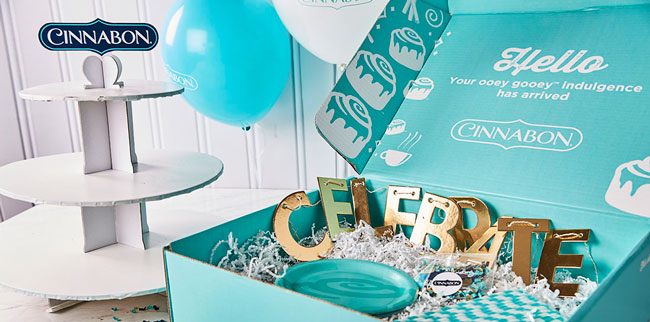 Choose from two celebration packages available exclusively at our bakeries below. Each order contains delicious Cinnabon product and a Celebration Box complete with a Cinnabon cake stand, confetti, paper straws, set of plates, balloons, and a celebration banner.