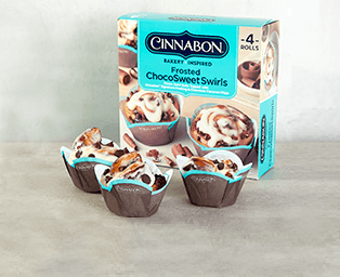 Chocolate swirled rolls topped with Cinnabon frosting and chocolate chips.