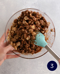 Once the peanut butter chocolate mixture is poured over the cereal, stir gently with a rubber spatula until the cereal is completely coated.